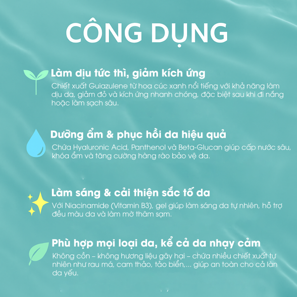 - Làm dịu da kích ứng, mẩn đỏ, sau mụn hoặc cháy nắng